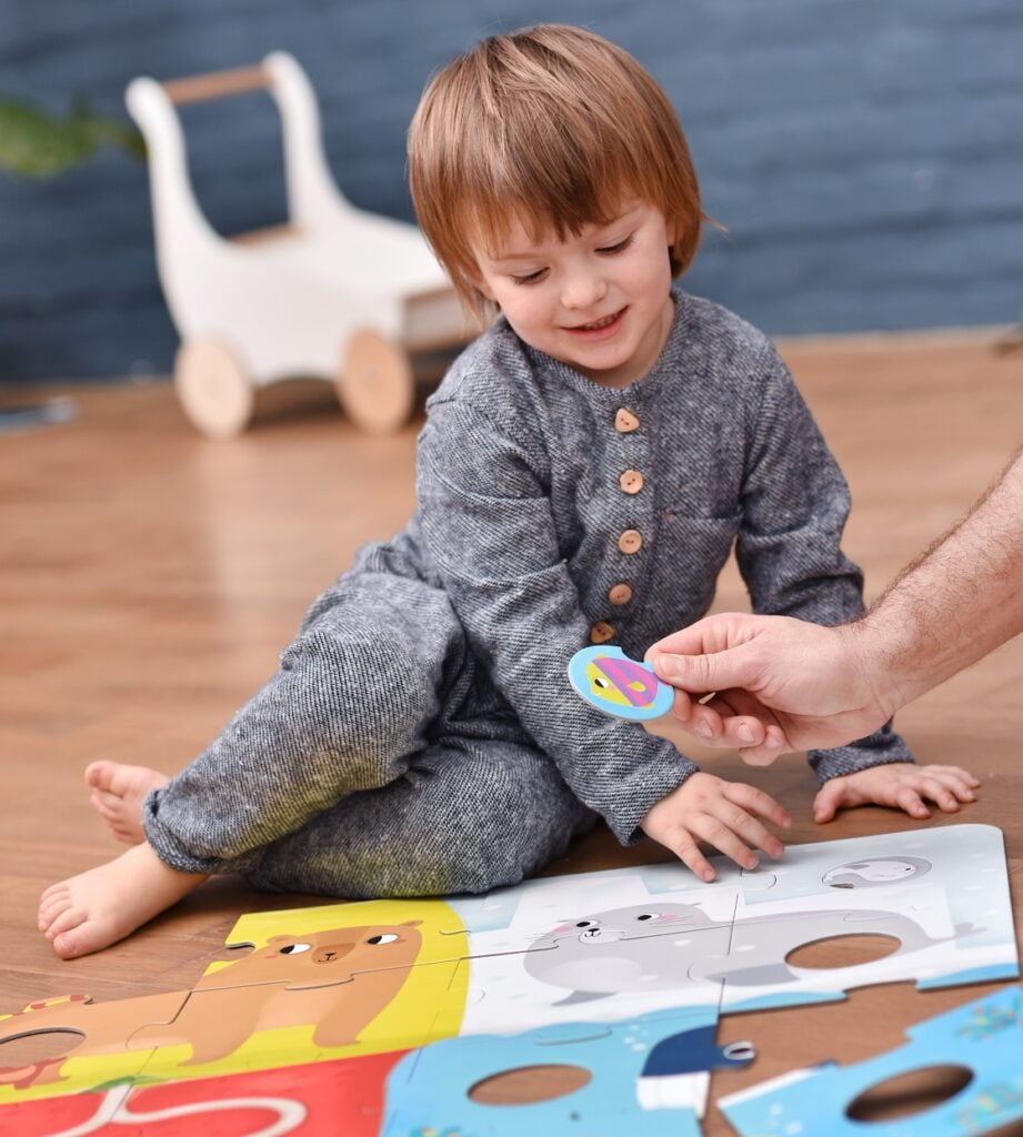 At Banana Panda, we make sure our guides and toys are age-adapted in terms of form and content. What does that mean? Puzzles for toddlers, who are still practising gripping objects and developing fine motor skills, are large and durable with no sharp edges and have fewer pieces. A 2-year-old usually cannot sit for too long in one place, so the best fun should incorporate physical movement, hence our ideas for Suuuper size puzzles and games, which are best played on the floor. The illustrations are incredibly colorful with just the right amount of detail, and the themes are adapted to the interests of young children: animals, vehicles and the activities happening in their immediate surroundings.