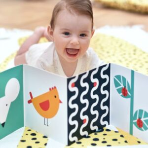 Large contrasting illustrations, adjusted to the visual perception of young infants, aid in the development of visual-spatial intelligence and recognition of object borders, which eventually facilitates grasping and mobility.
