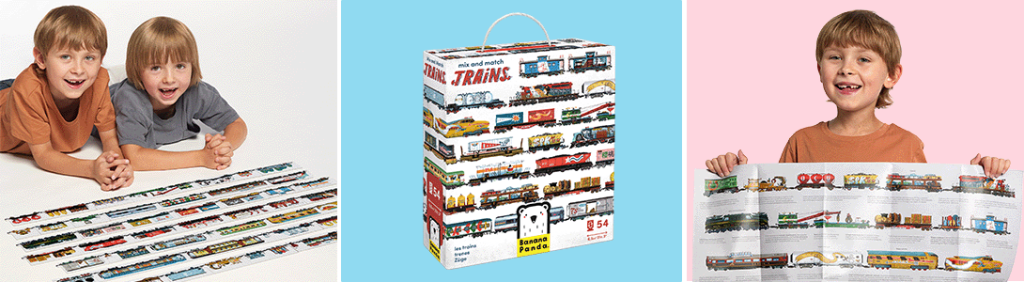 Puzzles are popular toys of brilliant simplicity that allow children to deepen their knowledge of favorite topics and explore completely new areas of interest. The fun begins with assembling the pieces, but it doesn’t end there. At Banana Panda, our aim is to inspire all forms of creativity, so we have adopted a completely innovative approach. The result is a unique puzzle that can be put together any way you like! The Mix and Match Trains set features 54 two-sided pieces that you can use to build the train of your dreams! Let’s take a closer look.