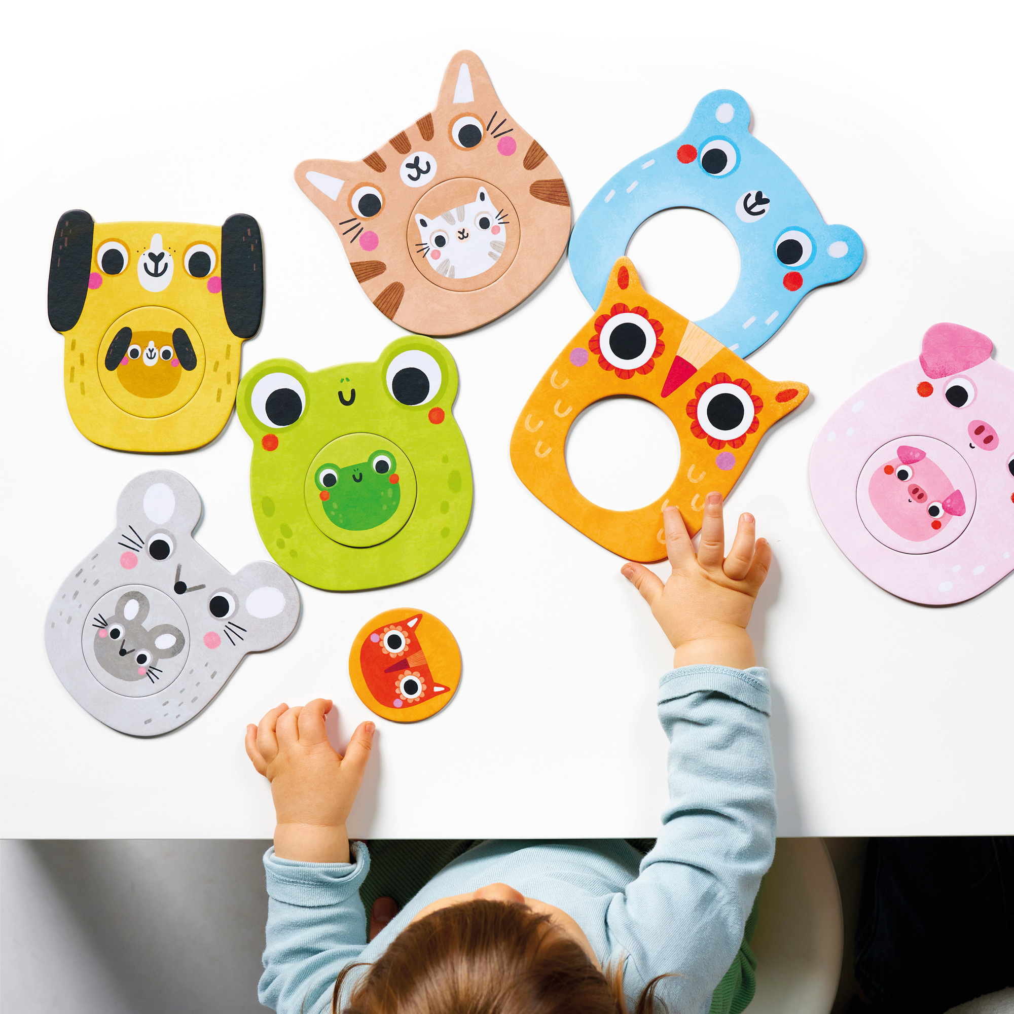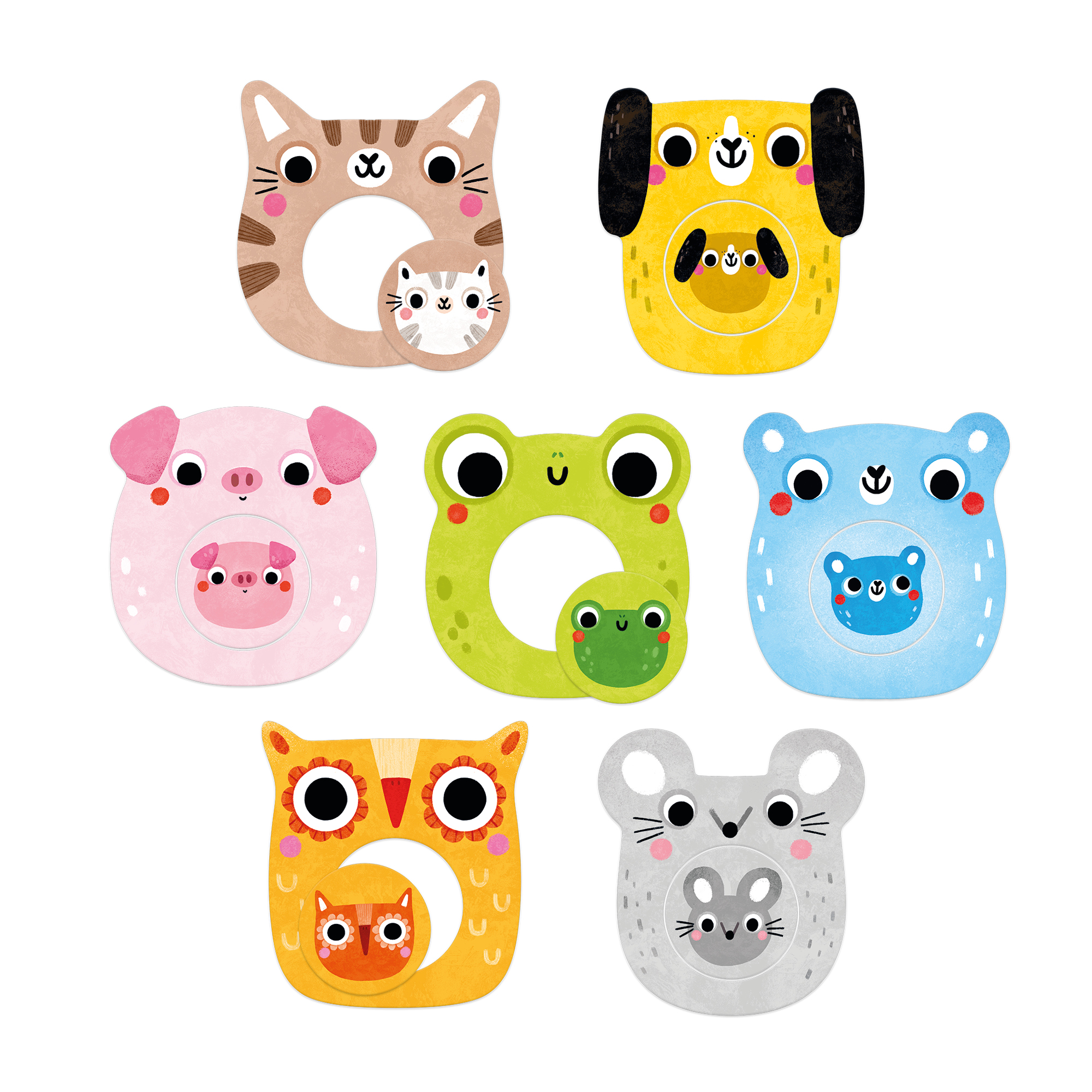 Name the animals, their colors, and shapes. Help your child notice differences and similarities between the puzzle characters. Who’s big, and who’s small?