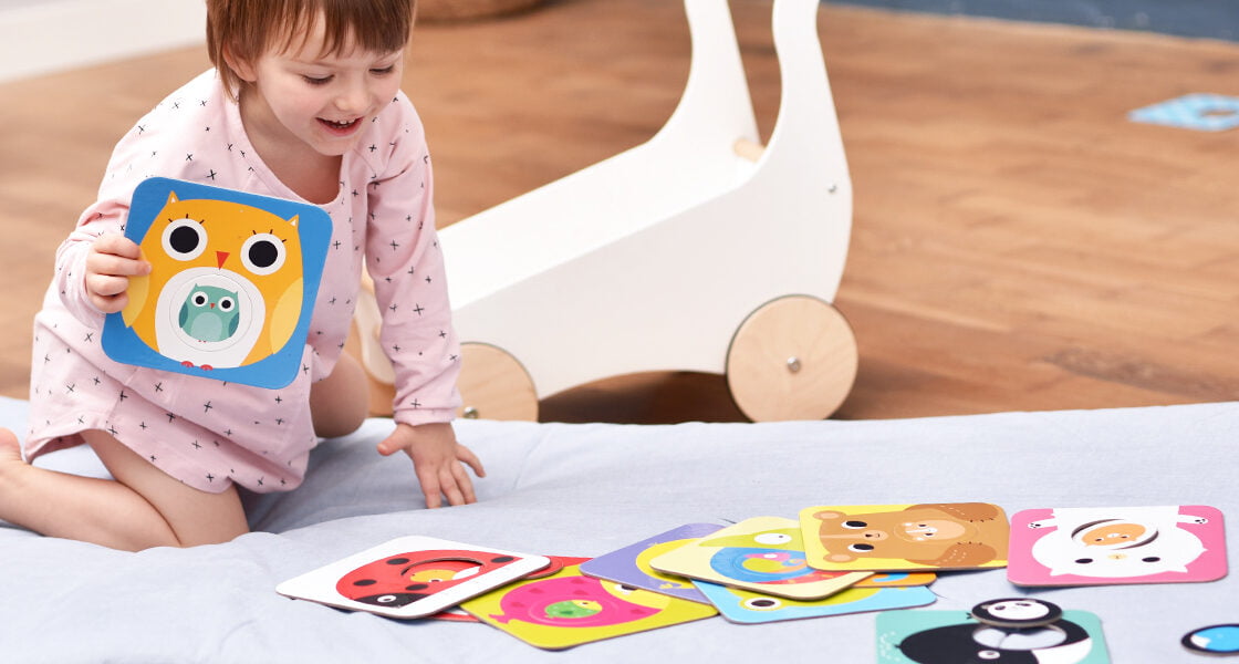 If your child chooses the wrong circle, say: “Not that one. It doesn’t fit.” Show your child the right animal and ask them to try to insert the piece. Gradually increase the number of cards and circles to choose from.