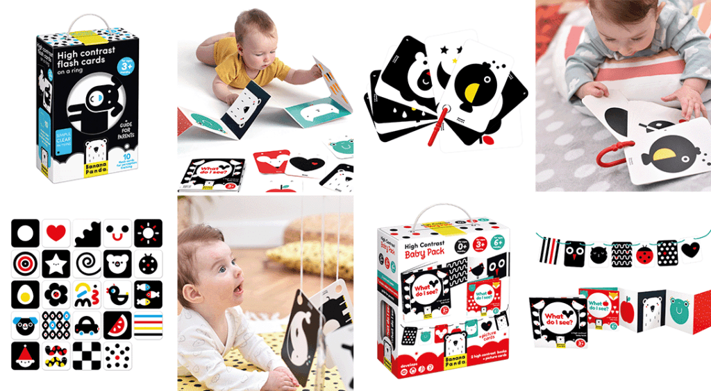 - Hanging toys. A mobile hanging over an infant’s bed, or from a playmat or stroller will catch their eye and eventually inspire them to reach for or move toward an object of interest. Contrast cards from the High Contrast Baby Pack, shown individually or connected together to create a garland, are great for hanging on a mobile.