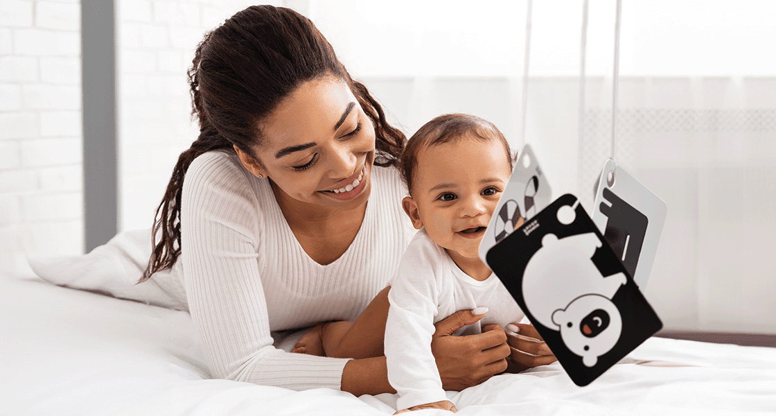 - Hanging toys. A mobile hanging over an infant’s bed, or from a playmat or stroller will catch their eye and eventually inspire them to reach for or move toward an object of interest. Contrast cards from the High Contrast Baby Pack, shown individually or connected together to create a garland, are great for hanging on a mobile.
